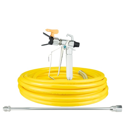 Naszymi agregatami malarskimi można również malować na wysokości. Przy założeniu, że urządzenie stoi na poziomie gruntu to pozwala się użytkownikowi na malowanie na wysokości wynoszącej połowę maksymalnej długości węża zalecanego do konkretnego agregatu malarskiego.