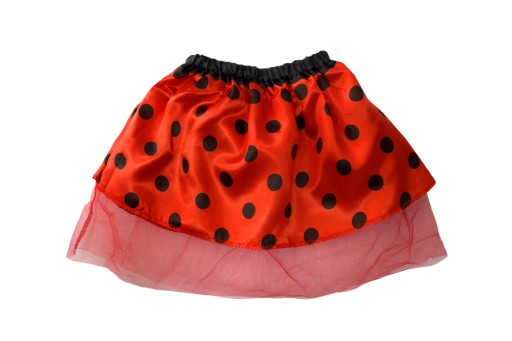 - Materiał: Poliestrowa spódniczka w kolorze czerwonym z czarnymi grochami. Podszyta czerwonym tiulem.