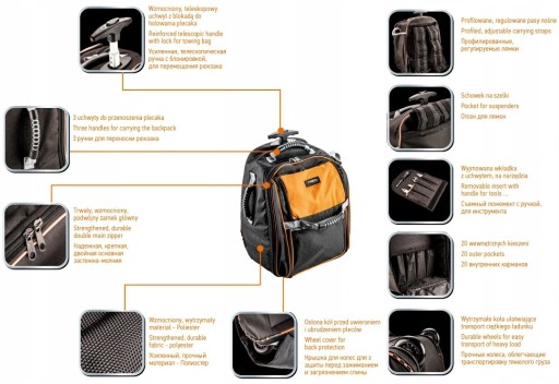 Plecak monterski na kołach NEO (nr ref. 84-303) wykonany z trwałego poliestru 600 D, gwarantującego długoletnią trwałość torby. Teleskopowy uchwyt z blokadą wraz z mocnymi kołami ułatwi transport ciężkiej zawartości. Plecak wyposażony jest w 3 uchwyty do przenoszenia ręcznego, 20 kieszeni wewnętrznych i wyjmowaną wkłądkę na narzędzia dla ułatwienia pracy. Marka NEO spełnia oczekiwania profesjonalistów.