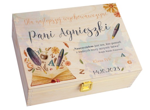 W cenie skrzyneczki jest personalizacja oprawy techniką nadruku utwardzanego światłem UV. Wykonany w ten sposób wzór jest trwały, precyzyjny i sprawia, że skrzynka staje się niezwykłą pamiątką.