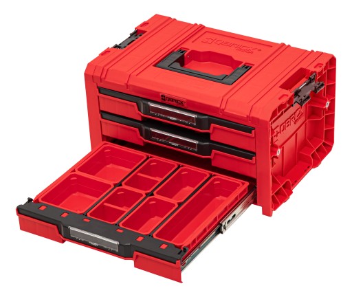 Qbrick System PRO Drawer 3 Toolbox Expert RED Ultra HD to pojemna, modułowa skrzynia narzędziowa wyposażona w trzy szuflady wysuwane na metalowych prowadnicach. Wygodny przycisk zapewnia łatwy dostęp do ich zawartości. Wersję Basic szuflady wyposażyliśmy w 9 regulowanych przegród pozwalających na organizację narzędzi i akcesoriów warsztatowych.