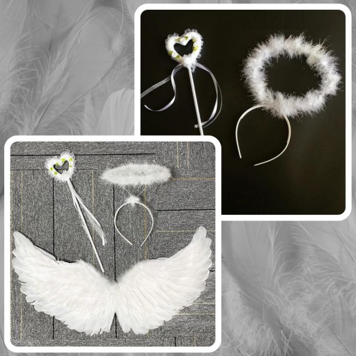 - Materiał: Piękne skrzydła wykonane z. naturalnych piór i ozdobione ptasim puchem. Zakładane na ramiona przy pomocy gumek. przytwierdzonych do skrzydeł.