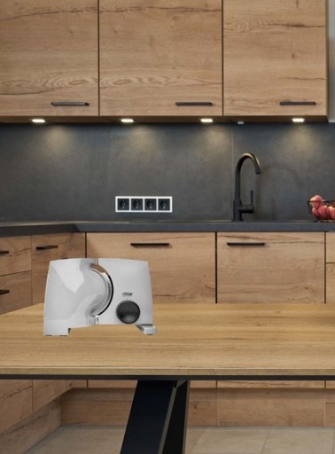 Moc jest tutaj! Krajalnica napędzana jest silnikiem eco o mocy 65 W, który jest o 20% bardziej ekonomiczny i o 50% mocniejszy. Zastosowanie tego energooszczędnego silnika wnosi pozytywny wkład w ochronę środowiska.