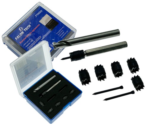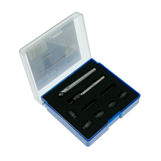 Zawiera 6 dwustronnych frezów koronkowych, uchwyt mocujący, 3 trzpienie ustalające oraz specjalne wiertło HSS 8 mm.