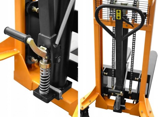 Podnoszenie ładunku odbywa się za pomocą dźwigni ręcznej lub pedału nożnego.