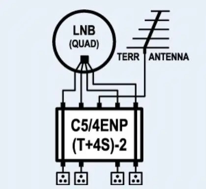 Sumator sygnału satelitarnego z LNB Quad, Monoblock Quad z sygnałem dvb-t na cztery przewody koncentryczne, który zakańczamy gniazdemi abonenckim RTV-SAT. Sumator C5/4ENP(T+4S)-2