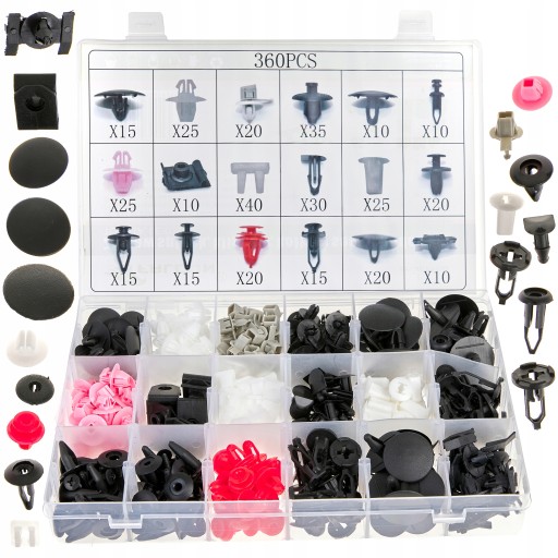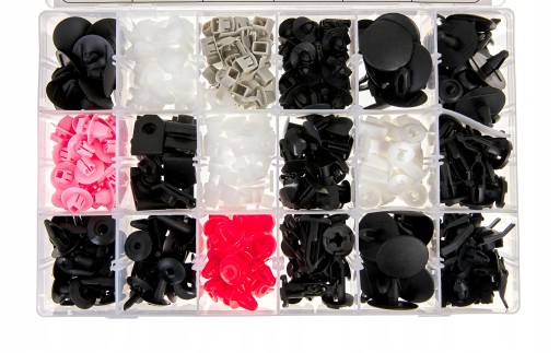 Zestaw plastikowych spinek do samochodów marki Toyota i Lexus. Opakowanie zwiera 18 typów spinek, łącznie 360 elementów. Całość zapakowana w pudełko z wygodnymi przegródkami.