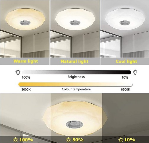 LAMPA SUFITOWA SMART LED RGB: Ulepsz inteligentną lampę sufitową domu za pomocą głośnika, łącząc światło dzienne i kolorowe nastrojowe światło w jedno, łącząc praktyczność i funkcję rozrywki w tym inteligentnym świetle LED RGB. Możesz swobodnie przełączać kolor oświetlenia między białym/ciepłym światłem a kolorowym światłem RGB, tworząc różne atmosfery oświetlenia w pomieszczeniach, białe światło dzienne, ciepłe światło nocne, kolorowe światło imprezowe, dowolny kolor.