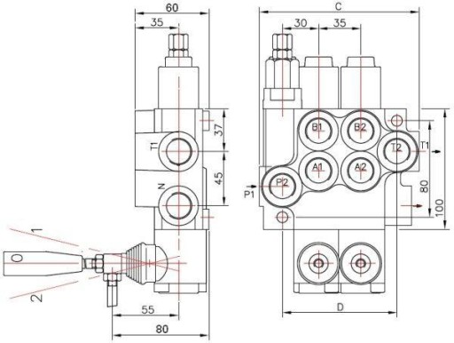 Specyfikacja techniczna: Gwint 1/2 cala Temp.pracy -40C…+60C Max ciśnienie robocze 300 bar(at) Wydajność 40L/min P - Zasilanie 1/2" T - Wyjście 1/2" pasują złączki: - [#G1/2X18#] - [#G1/2X22#] siłowniki 3/8" pasują złączki: - [#G3/8X18#] - [#G3/8X22#] Gwinty: P góra - G1/2” 14/1 P - G1/2” 14/1 T góra - G1/2” 14/1 T - G1/2” 14/1 N - G1/2” 14/1 wyjście sekcja I - 2xG3/8” 19/1 wyjście sekcja II - 2xG3/8” 19/1 wyjście sekcja III - 2xG3/8” 19/1 wyjście sekcja IV - 2xG3/8” 19/1 wyjście sekcja V - 2xG3/8” 19/1
