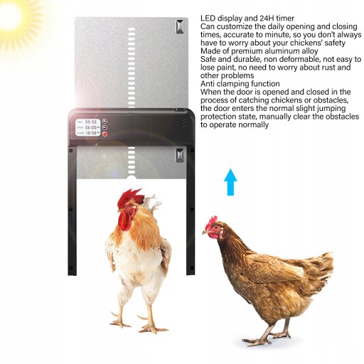 2. Wyświetlacz LED z timerem: drzwi kurnika mają wyświetlacz LED i 24-godzinny timer, możesz dostosować dzienne godziny otwierania i zamykania, z dokładnością do minuty, więc nie zawsze musisz się martwić o bezpieczeństwo swoich kurczaków.