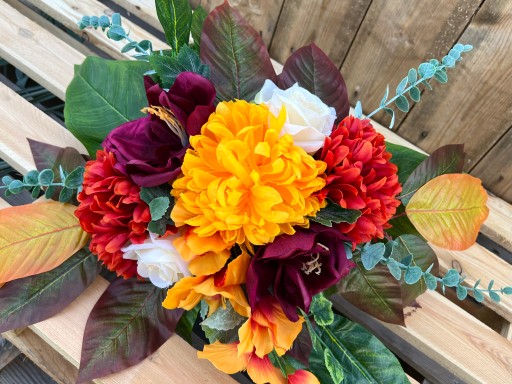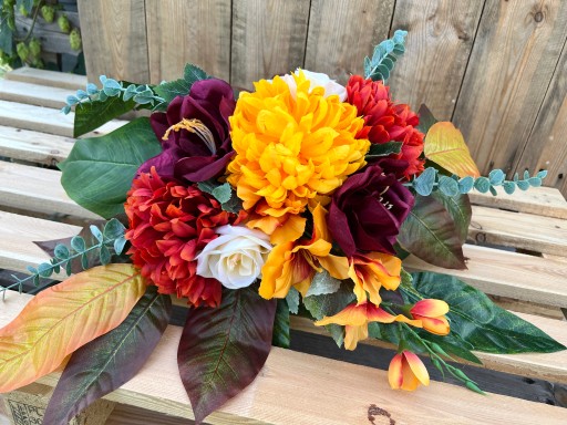 Bardzo ładna wiązanka w wyrazistych, jesiennych kolorach, wykonana z dodatków florystycznych wysokiej jakości.