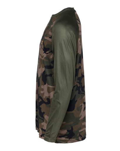 Posiada klasyczny krój z okrągłym dekoltem, kamuflaż na piersi i zielone rękawy oraz atrakcyjne logotypy.