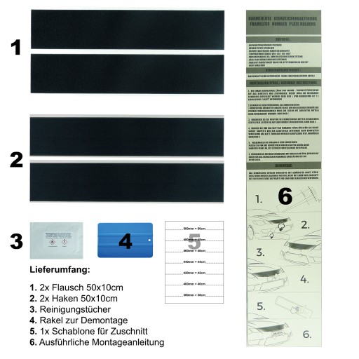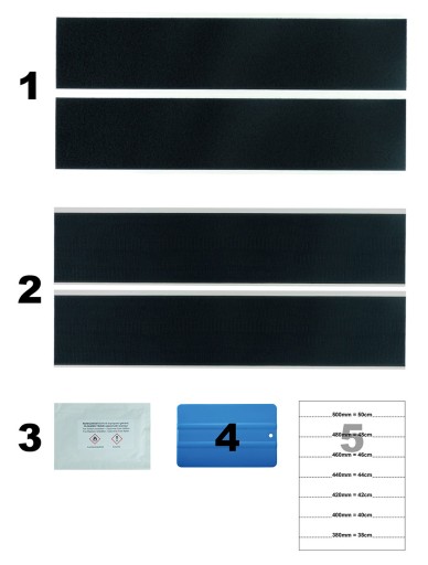 1. Podkładki pasują do tablic rejestracyjnych o różnych rozmiarach, od 380mm do 500mm w zależności od potrzeb można dowolnie podcinać. W tym celu należy przykleić załączony szablon, patrz rysunek 1.