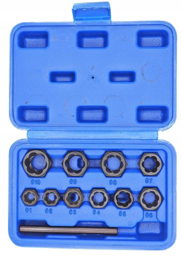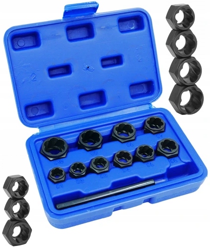 Zestaw specjalistycznych nasadek do wykręcania obrobionych śrub, nakrętek itp. Specjalny kształt wewnątrz nasadki, umożliwia wgryzienie się w główkę obrobionej śruby lub nakrętki w celu zakleszczenia się. Zewnętrzna budowa nasadki umożliwia użycie klucza płasko-oczkowego lub nasadki 6-kąt. Biorąc pod uwagę, precyzję wykonania pracy odkręcenia obrobionej śruby lub nakrętki, nie należy stosować do tych operacji klucza udarowego.