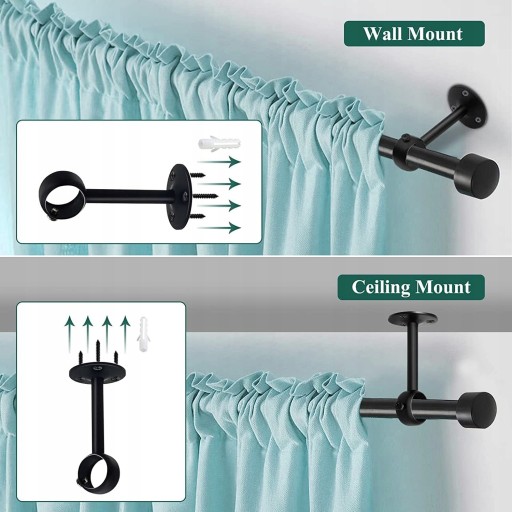 Uchwyt ścienny lub sufitowy – dwa sposoby montażu (śruby i kotwice są dołączone). Uchwyty na karnisze można zamontować na stałe jako wspornik karnisza sufitowego, który idealnie się układa i tworzy przegrodę pokojową lub jako uchwyty ścienne do karnisza do wieszania ręczników, ubrań, krawatów i innych przedmiotów.