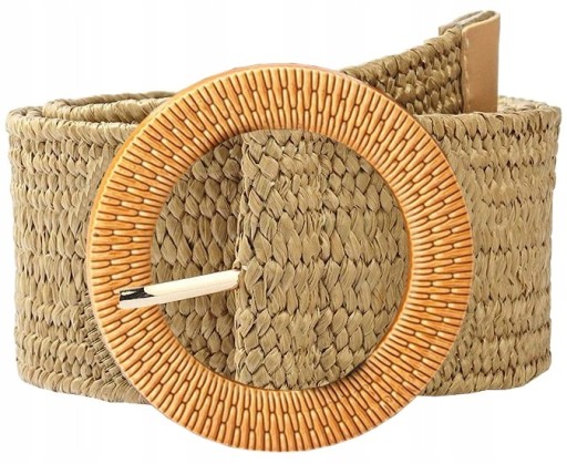 Pasek damski słomiany modny elastyczny do sukienki - KLAMRA koło Jest idealna do każdej wiosennej stylizacji, kreacji Pasek z klamrą okrągłą, pasek elastyczny rozciąga się, słomiany, pleciony Wymiary klamry: 7,5 cm x 7,5 cm Szerokość paska: 5 cm Długość paska z klamrą : 100 cm Materiał : elastyczny ekologiczny