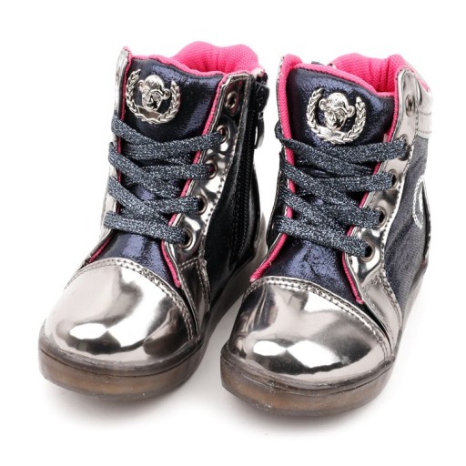 Sneakersy, trzewiki dziewczęce na płąskiej podeszwie. Z cholewką kończącą się nad kostką. Udekorowane z boku serduszkiem. Nosek okragły lakierowany. Wykonane ze świecącego materiału w połaczeniu z ekoskórą lakierowaną. Zapinane na suwak od wewętrznej strony, z przodu sznurówki.