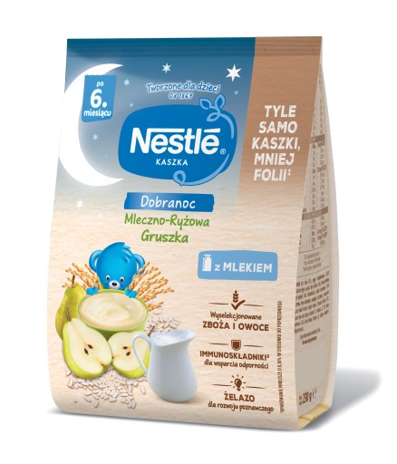 Pełnowartościowy, bezglutenowy posiłek o smaku gruszkowym dostosowany do potrzeb i możliwości niemowląt i małych dzieci. Kaszka mleczno-ryżowa Dobranoc Gruszka od Nestlé zawiera immunoskładniki* (cynk, żelazo, witaminy A** i C), jod, ALA (omega-3), 11 witamin oraz kultury bakterii Bifidobacterium lactis.