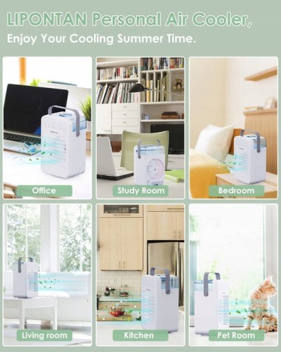 Mini klimatyzator, wentylator, nawilżacz, oczyszczacz powietrza i lampka nocna LED Konstrukcja 5 w 1. Dodaj wodę lub kostki lodu, aby szybko ostygły, może również działać jako wentylator, gdy nie ma wody. Nie tylko obniża temperaturę otoczenia, ale także pomaga chronić nas przed suchym, brudnym powietrzem oraz ogranicza kurz i bakterie. Przynieś nam chłodne, świeże i przyjemne powietrze.