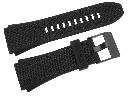 Oryginalny pasek do zegarka marki Diesel do modelu DZ4548 materiałowo- gumowy w kolorze czarnym, sprzączka wykonana ze stali nierdzewnej w kolorze czarnym matowym z napisem Diesel.