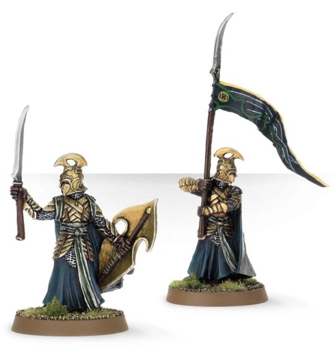 Elfi kapitanowie i Elfi Chorągwie poruszają się w awangardzie elfich armii Drugiej Ery. Ten zestaw zawiera 1 Elf Banner Bearer i 1 Elf Captain. Są to metalowe modele Cytadeli, które są dostarczane niepomalowane i wymagają montażu. Zalecamy użycie kleju Citadel Super Glue i farb Citadel.