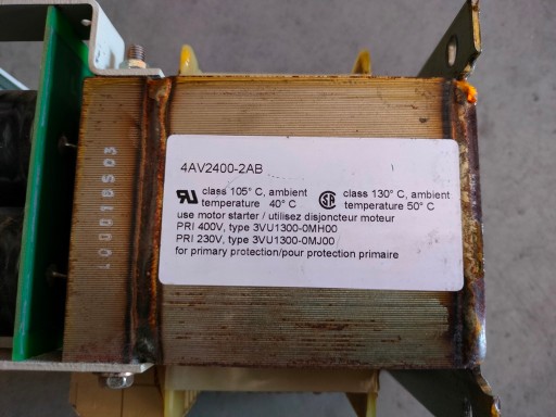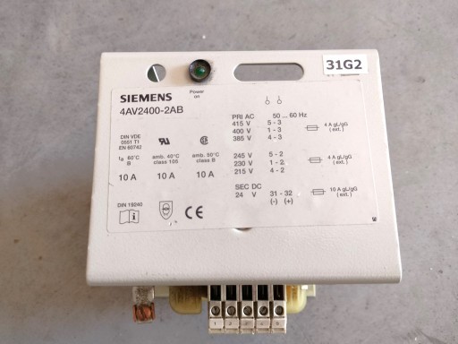 Do sprzedania Używany, całkowicie sprawny i w bardzo dobrym stanie zasilacz transformatorowy Siemens 4AV2400-2AB 24VDC 10A zasilanie 215-245VAC lub 385-415VAC. Napięcie wyjściowe 24 VDC do 10A.
