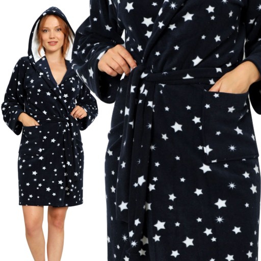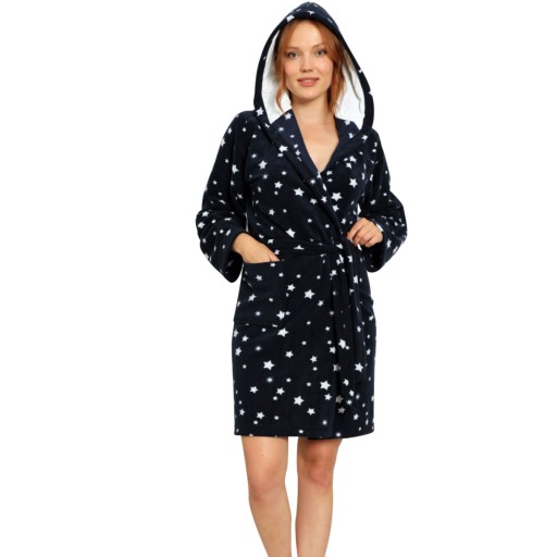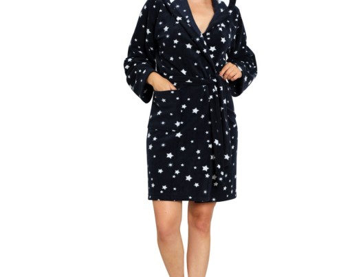 Szlafrok wiązany w pasie, dzięki czemu można go dowolnie dopasować do sylwetki. Dodatkowo kieszeń z prawej strony. Całość w kolorze granatowym w gwiazdki Kaptur od wewnątrz oraz mankiety zostały starannie wykończone.