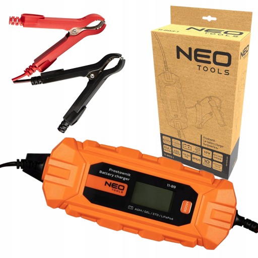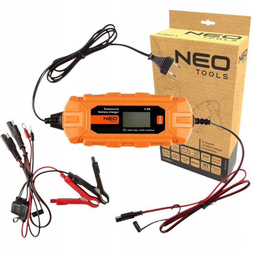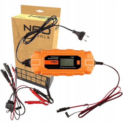 Prostownik automatyczny 10 A/160 W, 3 – 200 Ah, do akumulatorów kwasowych / AGM / GEL 11-893-1 marki NEO posiada możliwość ładowania akumulatorów nawet głęboko rozładowanych, będąc w stanie zregenerować je nawet od napięcia 3V. Polecany także do podtrzymywania ich w pojazdach mechanicznych i przedłużania żywotności. Kompatybilny z akumulatorami kwasowymi STD/AGM/GEL/LiFePO4. Prostownik oferuje sterowanie mikroprocesorowe oraz wbudowany wyświetlacz LCD, pokazujący dane o ładowaniu. Oddzielne ustawienia trybu ładowania zwiększają jego możliwości – podobanie jak sposobność zachowywania pamięci i danych podczas wymiany baterii. Posiada wbudowane zabezpieczenia, m.in. przed zwarciem końcówek, odwrotnym podłączeniem, przegrzaniem czy przeładowaniem akumulatora. Klasa izolacji IP65. Funkcje konserwacji, regeneracji i testu baterii przydają się profesjonalistom jak i fanom motoryzacji. Typ ładowania 10-stopniowy w pełni automatyczny. Prąd ładowania to 2A/10A. Napięcie obsługiwanych akumulatorów wynosi 6V/12V, a moc 160 W. Napięcie zasilania urządzenia to 220-240 V, 50-60Hz. Długość kabla wynosi 1,5 m. Prostownik funkcjonuje na baterii 3-200 Ah. Oferowany jest w zestawie z dodatkowymi kablami do podłączenia auta oraz instrukcją.
