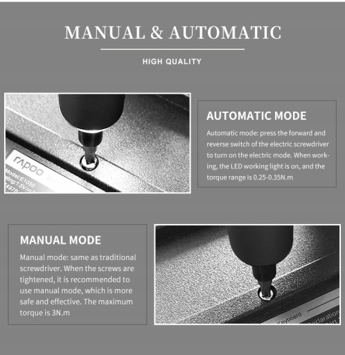 Wkrętak posiada ultra ciche sprzęgło z momentem obrotowym 0,25-0,35N.m w trybie elektrycznym i 3N.m w trybie manualnym.
