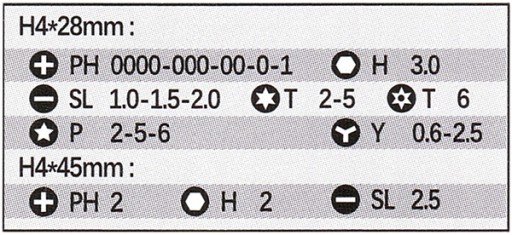 - 20 bitów o długości 28 i 45mm oraz szerokości mocowania 4mm,