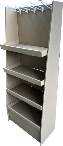 Jesteśmy producentem opakowań i artykułów reklamowych z tektur. W naszej ofercie następny regał -stand tekturowy. Model INPO 016. Podstawa 60x30cm, wys.1400cm, bardzo solidny i stabilny, wykonany z tektury 5 warstwowej FalaEB koloru naturalnego. Półki wsuwane w tylną ściankę, oparte na kątownikach tekturowych, wpinanych w boki standu. Półki co 27cm, rozmiary wewnętrzne półki 58X27cm. W górnej częśći możliwość montażu haczyków na perforację o szerokości 25 mm. Regał również przygotowany pod grafikę. Kaszerujemy ( oklejamy wydrukami offsetowymi) wg grafiki klienta. Możemy również na zamówienie wykonać regał z tektury kolor naturalny lub biały.Cena obejmuje model standu-regału jak na zdjęciu z tektury brązowej, bez haczyków. Cena brutto. Możemy również wykonać dowolny rozmiar regału dla potrzeb klienta, wiąże się to jednak z kosztami projektu i wykrojnika. Dostawa max 2 szt regałów na płasko w jednej przesyłce. Nie wymaga sklejania. Bardzo estetyczny i nowoczesny design.