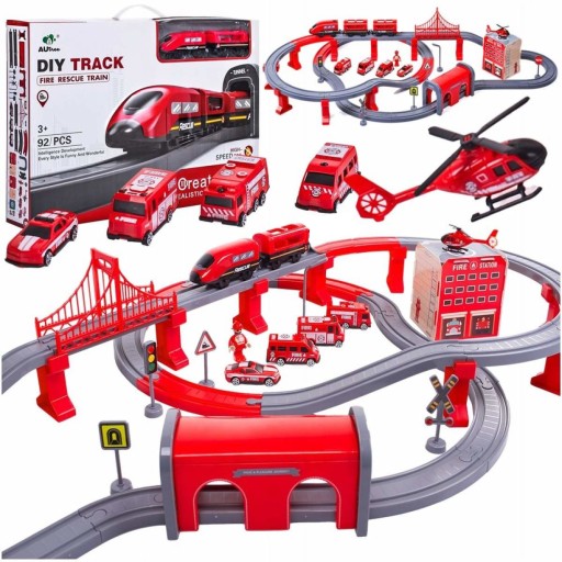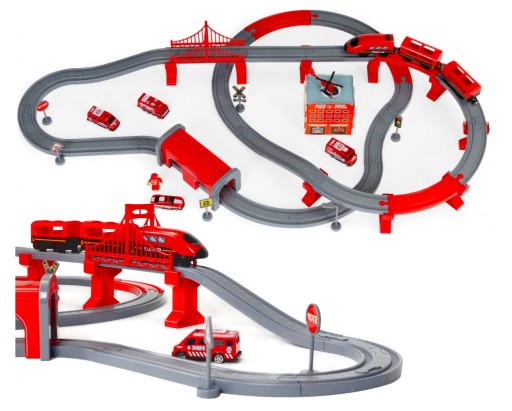Wykonana z niebywałą starannością i dbałością kolejka z pojazdami straży pożarnej stanowi doskonałe miejsce do zabawy dla przyszłego maszynisty lub strażaka. Zestaw został uzupełniony o atrapę remizy strażackiej z lądowiskiem dla helikoptera, tunel, most, wiszący oraz znaki drogowe i kolejowe. Wszystkie elementy są wykonane z najwyższej jakości plastiku, co gwarantuje długotrwałą żywotność i wytrzymałość poszczególnych elementów zestawu.