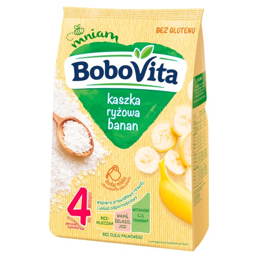 Wybierz dla Twojego dziecka kaszki, które dostarczą mu radości z jedzenia i kluczowych składników odżywczych. Bezmleczne ryżowe kaszki BoboVita zawierają wyjątkową kompozycję wysokiej jakości ryżu, pysznych owoców oraz witamin i cennych składników mineralnych – m.in. wapnia i żelaza. Ich skład i konsystencja odpowiadają potrzebom niemowląt i małych dzieci. Można je przygotować odpowiednio na mleku modyfikowanym lub, w przypadku alergii na białka mleka krowiego, na preparacie *mleko*zastępczym. Są odpowiednie także dla dzieci na diecie bez*gluten*owej. Dzięki bogactwu smaków pomogą wprowadzić do diety Twojego dziecka różnorodność.