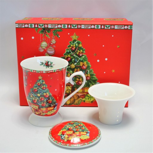 Przepiękny porcelanowy kubek z zaparzaczem motywem świątecznym. Do kubka dołączono zaparzacz z gęstym sitkiem oraz pokrywkę. Idealnie sprawdzi się również jako ozdoba stołu czy komody w domu i w pracy. Wykorzystasz jako samodzielną dekorację stołu, do serwowania herbaty czy ziół w świątecznym okresie. Prezentowany kubek przyciąga oko oryginalnością może służyć jako idealny prezent świąteczny czy mikołajki.