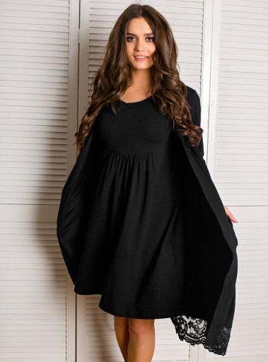 CZARNY BAWEŁNIANY SZLAFROK GRACE - KORONKA
