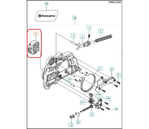 Oryginalne pokrętło stanowiące element pokrywy sprzęgła do pilarek spalinowych marki Husqvarna z napinaczem beznarzędziowym. Numer katalogowy: 579070601.