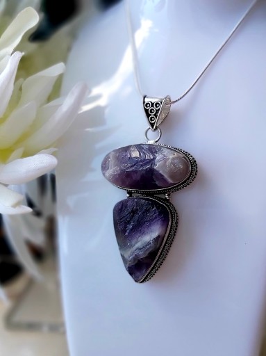 Zrobiono z indyjskiego srebra(ze stopu srebra i miedzi).Centrum wisiorka zdobi oprawiony naturalny Ametyst. Ręczne wykonanie indyjskiego jubilera. Nowy bez metki.