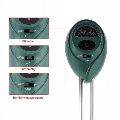 Może mierzyć wilgotność gleby\stopień PH\siłę światła słonecznego wymaganego do fotosyntezy roślin.