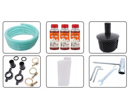 W zestawie pełen zestaw akcesorii potrzebnych do montażu i eksploatacji pompy.
