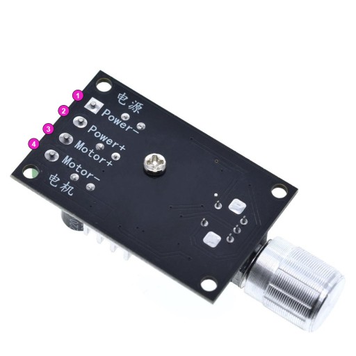 Ten kontroler prędkości silnika DC umożliwia sterowanie kierunkiem obrotów silnika DC za pomocą napięcia DC modulowanego szerokością impulsu (PWM) o współczynniku wypełnienia w pełni regulowanym od 0% do 100%.