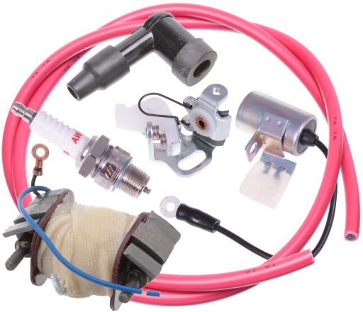 - W SKŁAD ZESTAWU WCHODZI: PRZERYWACZ ZAPŁONU, 1 METR PRZEWODU ZAPŁONOWEGO, ŚWIECA ZAPŁONOWA B7HNS F80, KONDENSATOR, FAJKA ZAPŁONOWA ORAZ CEWKA ZAPŁONOWA