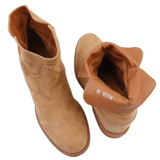 BOTKI DAMSKIE OCIEPLANE NA UKRYTUM KOTURNIE BUTY ZIMOWE ZAMSZOWE CAMELOWE