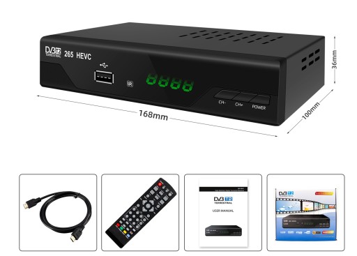 - Gniazda: Wejście antenowe, wyjście antenowe, wyjście Coaxial, wyjście HDMI, wyjście SCART