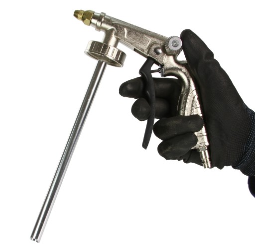 Korpus pistoletu wykonany jest z aluminium, pistolet pasuje do typowych 1 i 2 litrowych puszek z gwintem do tzw. „ baranka''. W komplecie wężyk z końcówką rozpylającą do profili zamkniętych.