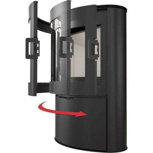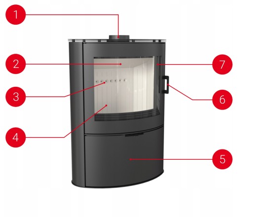 3. Potrójny obieg powietrza: W urządzeniu zastosowano potrójny system dopowietrzenia komory spalania. Powietrze pierwotne, ułatwiające rozpalanie drewna dostarczane pod ruszt. Powietrze wtórne, zapewniające ekologiczne spalanie - dostarczane otworami w tylnej ścianie paleniska. Kurtyna powietrzna, system czystej szyby w którym powietrze dostarczane jest bezpośrednio na szybę poprzez system kanałów umieszczonych na bokach pieca.