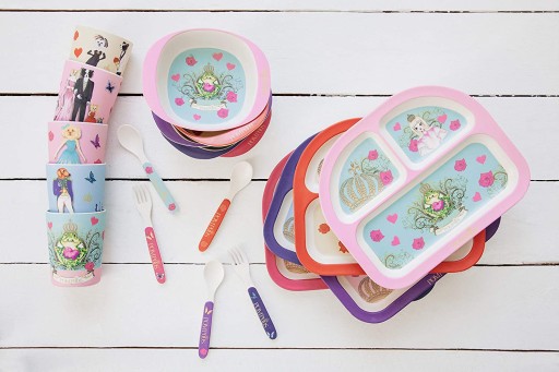 - Wymiary produktu: talerz: 24 cm x 20 cm x 1 cm; miska: 15 cm (średnica) i 4 cm (wysokość); kubek: 7,5 cm (średnica) i 10 cm (wysokość); sztućce: 13 cm