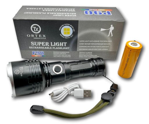 - Zasilanie: akumulator 26650 8800mAh 4,2V lub 3x bateria AAA