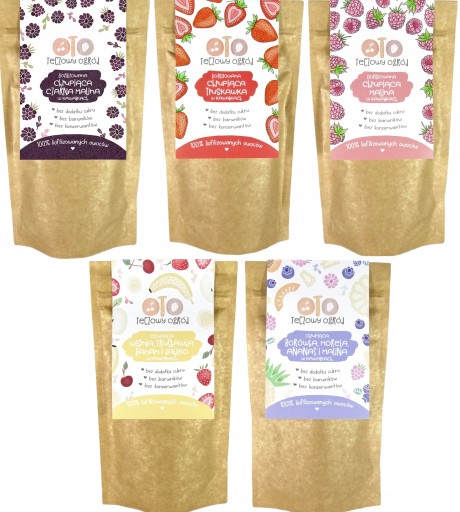 OTO Tęczowe owoce liofilizowane to świetna zdrowa przekąska, suchy prowiant, a także chrupiący dodatek, gdyż mogą być stosowane wszędzie tam, gdzie i świeże owoce: jako dodatek do serków, jogurtów, ulubionych musli, smacznych owsianek czy deserów oraz ciast. Owoce liofilizowane z OtoLandii można zabrać ze sobą do pracy, do szkoły, na wycieczkę czy spacer z dziećmi na drugie śniadanie lub przekąskę. Zapakowane są w ekologiczne, szczelnie zamykane opakowanie ze struną wielokrotnego użytku.
