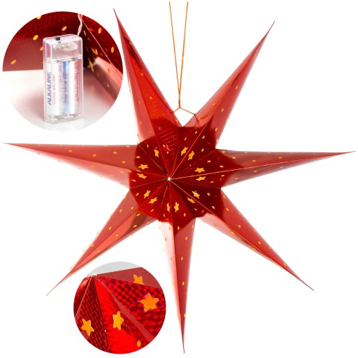 ❤️ Chcesz w szybki i efektowny sposób przystroić swoje mieszkanie na święta? Wybierz papierową gwiazdę z lampkami LED w świątecznym czerwonym kolorze, która po podświetleniu zamienia się w oryginalny witraż. Gwiazda jest zasilana na baterie, więc możesz zawiesić ją wszędzie tam, gdzie chcesz, bez ograniczeń związanych z odległością od kontaktu. Do ozdoby został dołączony sznurek, dzięki czemu z łatwością umieścisz ją na oknie, drzwiach, ścianie czy choince.