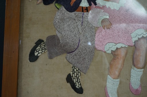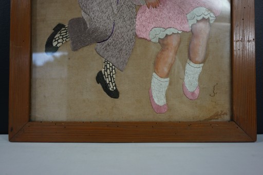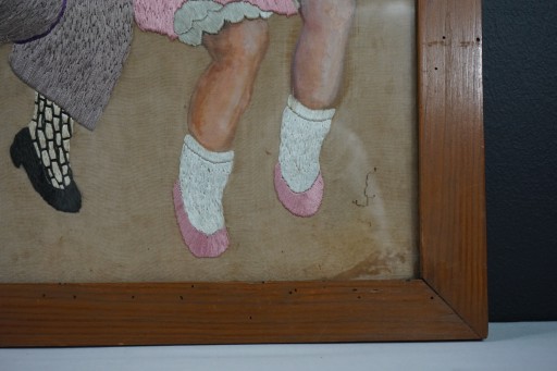 Haftowany i malowany obrazek. Przedmiot z lat 20/30 ubiegłego stulecia. Rama drewniana, całość za szybą. stan widoczny na foto. Wymiary: 41.5cm x 51.5cm.
